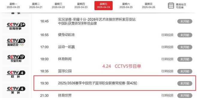 央视网:《CCTV5节目官网节目单》直播吧:《媒体人:MVP是贺希宁&胡金秋之争 前者个人球队双突破 大秋依旧稳》2026年4月20日虎扑体育:《CBA季后赛赛制更改为3357,八强战是否将增加爆冷可能?》2026年4月23日雷速体育:《广东官方:签约尼古拉斯·拉科塞维奇,新中锋驰援季后赛冲刺》2026年4月22日北京青年报:《CBA|新赛季外援上场仍执行4节7人次》2025年11月26日
