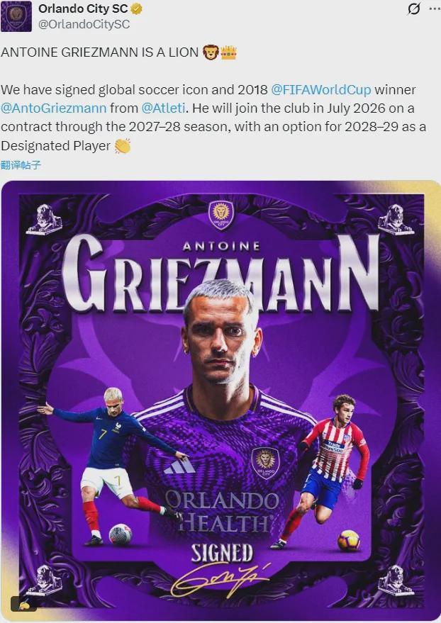 官方:奥兰多城宣布和马竞就格列兹曼的交易达成了协议,这名球星将在今年7月份正式登陆MLS,交易为自由转会,法国人将签下一份2028年到期的2年合同,附带延长一年条款。